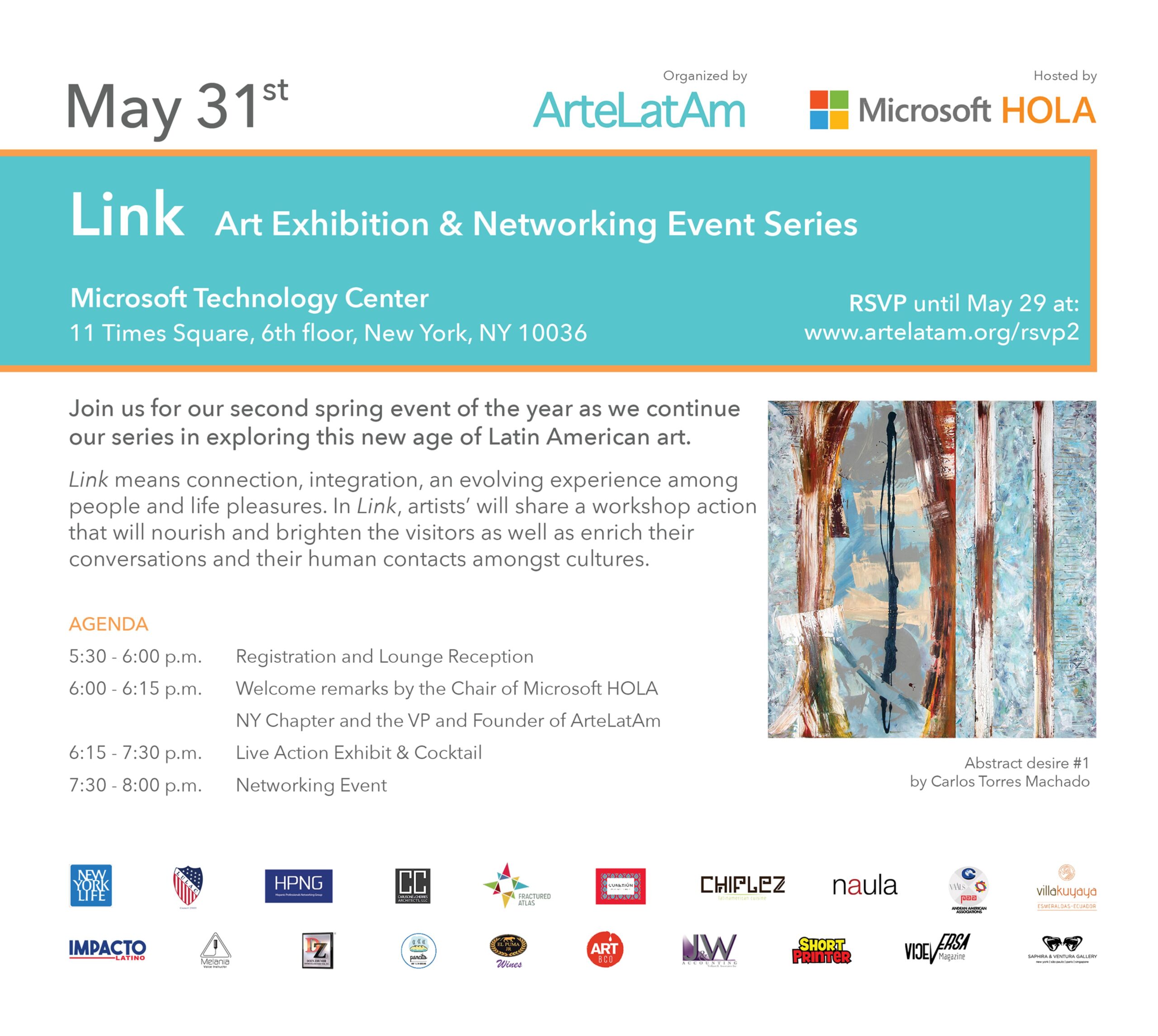 This exhibition was created with the mission of expanding connections among Latino-Hispanic employees at Microsoft and Latin American artists in New York City. HOLA-Microsoft Corpo- ration, LULAC, and ArteLatAm have united forces to organize a networking event showcasing five of the most influential, emerging, Latin American visual artists living in New York. It will be a fusion of an art exhibition, and a meet and greet event to illustrate the many characteristics of the Latin American community. Linked culturally, professionally, and technologically, our art exhibition and networking event aims to gather a diverse audience from all socioeconomic and racial backgrounds. The featured artists will be showing approximately 13 art pieces con- sisting of drawings, paintings, and sculptures, each with their own unique style. The selec- tion of artworks will show the various facets of the artists’ creative processes and identities.